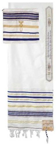 The crown neck says Blessed are you O Lord God King of the Universe who has fulfilled all of the Torah through Yeshua the Messiah and has covered us with His righteousness.. The corners in Hebrew say Pray for the peace of Jerusalem. Most of our prayer shawls and tallits have the translation on the crown Blessed are you O Lord our God King of the Universe who has commanded us to wear the tzitzit fringe.