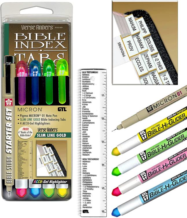 This all-in-one Bible Study Starter set includes everything you need to start studying your Bible. Includes (4) different eye-catching bright neon fluorescent gel highlighters, (1) Pigma Micron 01 0.25mm, (1) Books of the Bible ruler/straight edge/bookmark, and a set of Verse Finder Bible Index Tabs. Both the Accu-Gel Highlighters and Sakura Pigma Micron have archival quality pigmented ink, that will not bleed through thin paper and does not smear or fade. Verse Finder Bible Index Tabs are easy to install, No alignment guides or folding required. Just press and stick. Tabs are self-aligning. Index your Bible in Minutes Not Hours. Attractive and durable for years of trouble-free use. SLIM LINE STYLE Extends only and installs in 4 rows. Set includes: (4) Accu-Gel Bible-Hi-Glider in yellow, pink, green and blue; (1) Black Pigma Micron 01 0.25mm; (1) Books of the Bible ruler/straight edge/bookmark; (1) Verse Finder Bible Index Tabs – Slim Line Silver (64 Tabs & 66 Books)