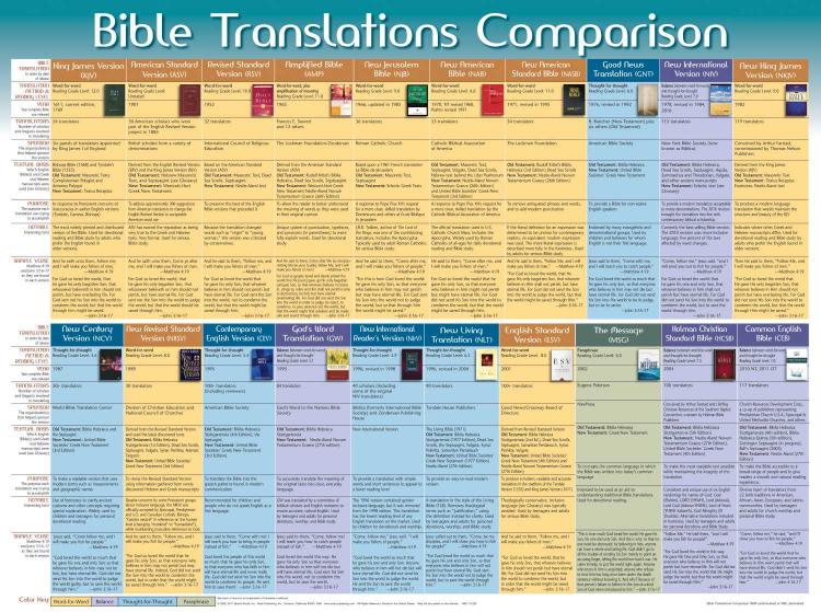Bible Translations Comparison offers help in understanding translators’ different approaches (word-for-word, thought-for-thought, paraphrase, or some combination of the three). It also gives background on source texts and tells which texts were used for each version.