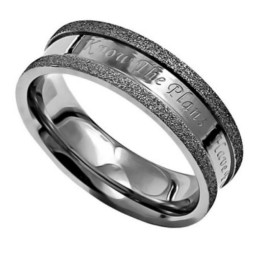 Stunning 5mm stainless steel Silver band is coupled at top and bottom with glitter shine and high polished interior comfort fit. Laser engraving reads, “I Know The Plans I have For You- In Christ Jesus (Jeremiah 29:11)”