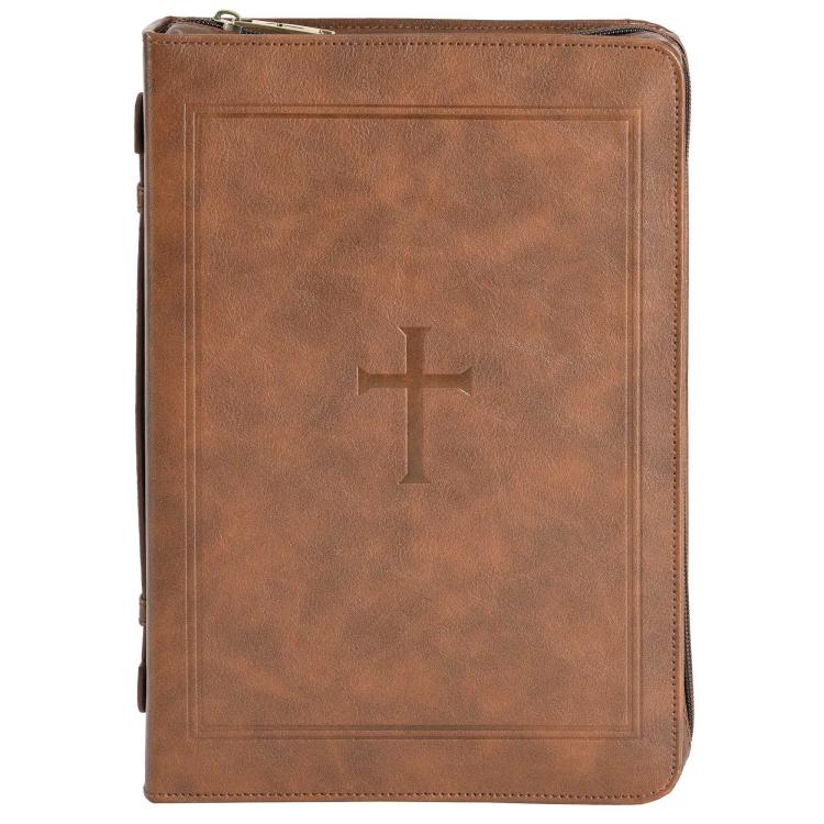 HARD SHELL STYLE- PU Bible cover . inside book mark & elastic pen loop; color brown, size XL; classic debossed cross on cover.