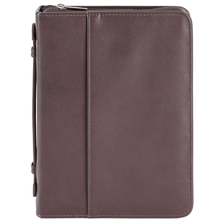 Hard Shell Style Polyurethane Bible Case. Solid Brown Color. Inside Is A Bookmark & Elastic Pen Loop With Cut Thru Cross Zipper Pull; Side Handle, Non-Rusting Self-Repairing Zipper, Nylon Reinforced Stitching, XL Dimensions: 7-1/4 x 2 x 10-1/4.