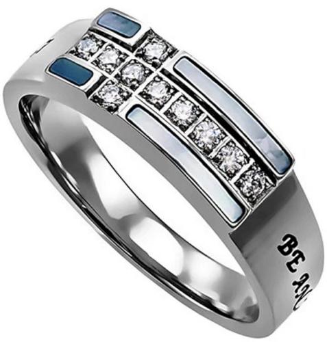 Stunning high polish stainless steel tapered band is channel set with cubic zirconium cross and genuine shell surroundings. Black enamel filled engraving wraps entire back from one end of the cross to the other.