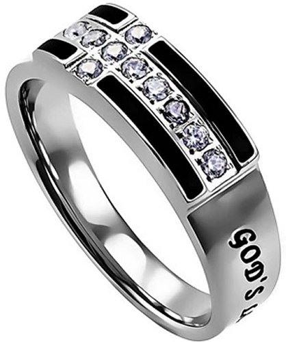 Stunning high polish stainless steel tapered band is channel set with cubic zirconium cross and black enamel surroundings. Engraving with black enamel filling wraps entire back from one end of the cross.
