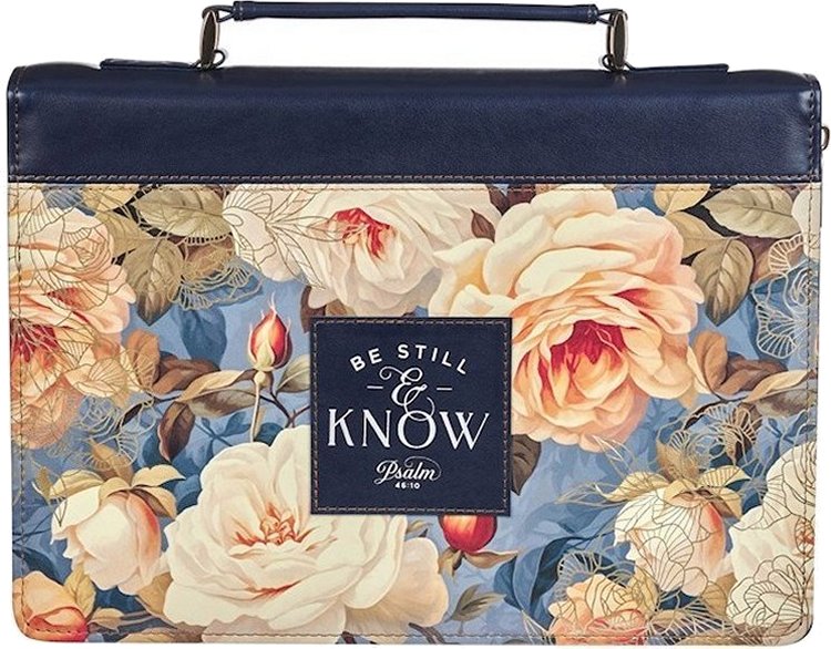 The gentle~ unhurried growth and blooming of the roses on the Be Still Serene Roses Blue Faux Leather Bible cover mirrors the spiritual practice of resting in God’s timing and plans for your life. This gorgeous Bible cover will keep your precious Bible safe from daily wear and tear~ and its message will bolster your heart against the daily assault of life.