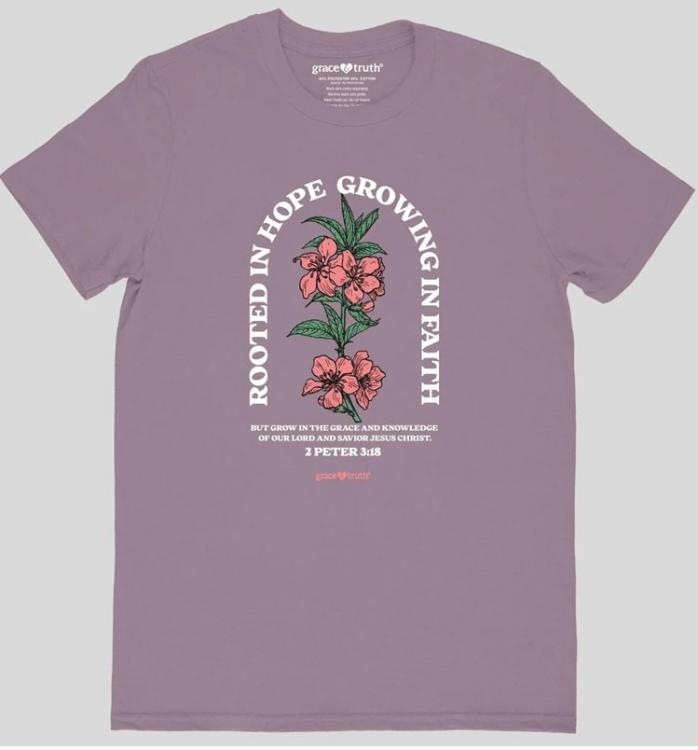 Grow strong in faith with the Rooted In Hope grace & truth T-shirt. Featuring a graceful floral illustration framed by curved lettering, this paragon-colored tee reflects steady growth rooted in God s truth. Inspired by 2 Peter 3:18, the message encourages believers to grow in grace, strength, and hope through Christ.