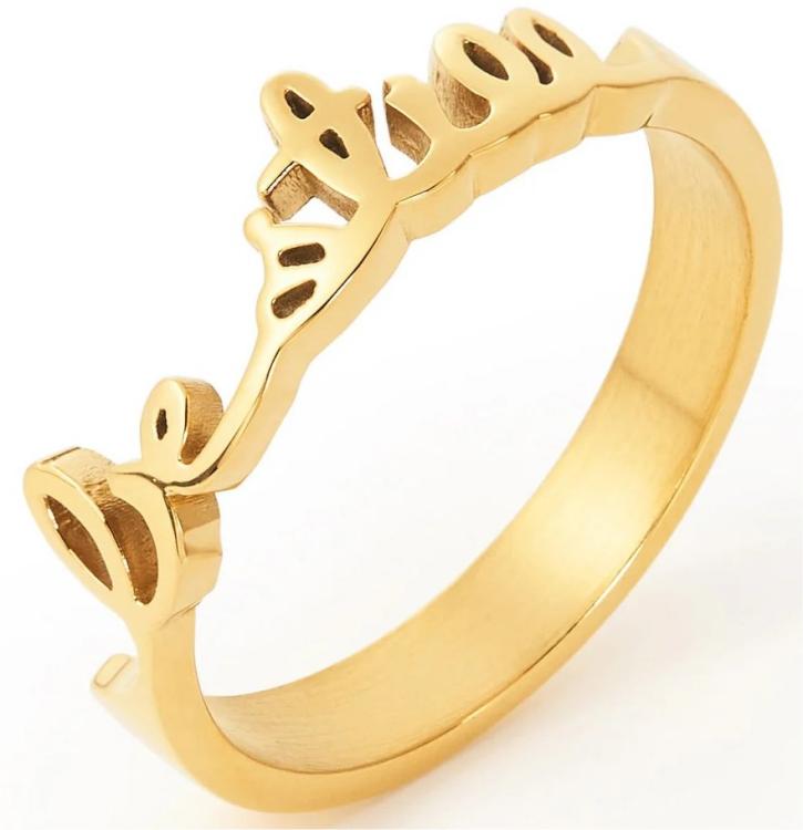 Stainless steel petite hand writing ring with 5mm script “be still” cut out. Engraved, black enamel filled, 3mm wrap around band reads “Be Still and Know that I Am God – Ps 46:10”.