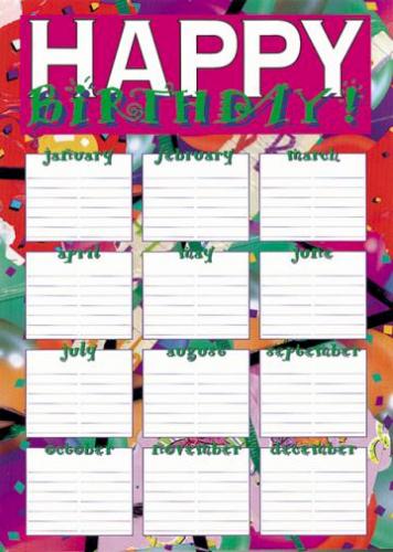 “This colorful chart provides churches with a way to recognize birthdays. The art is bright art and the cost is low enough to enable every class to have one. It displays birthdays for the entire year.”