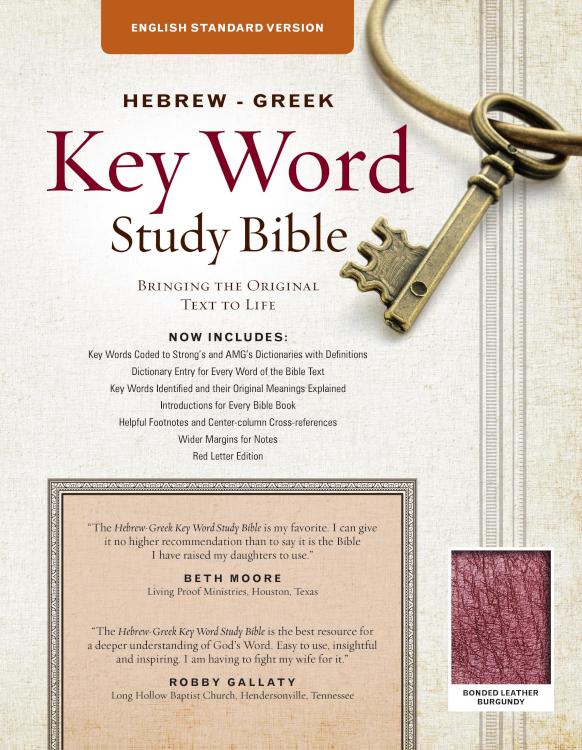 There are times when a Greek or Hebrew word has a distinct meaning that seriously affects the proper interpretation of Scripture. Unless you are familiar with these languages, you will not be able to determine what word in the original text was used or the differences between these words-until now.The Hebrew-Greek Key Word Study Bible identifies the key words of the original languages and presents clear, precise explanations of their meaning and usage. Those who love God’s Word will treasure this Bible, for it contains a whole library of biblical helps within its covers. NOW INCLUDED* Wider Margins on Pages of the Bible Text* Key Words in the Biblical Text Coded to Strong’s Numbers* New Word Studies with AMG’s Annotated Strong’s Dictionaries* Red Letter Edition of the English Standard Version of the BibleBONDED LEATHER BURGUNDY