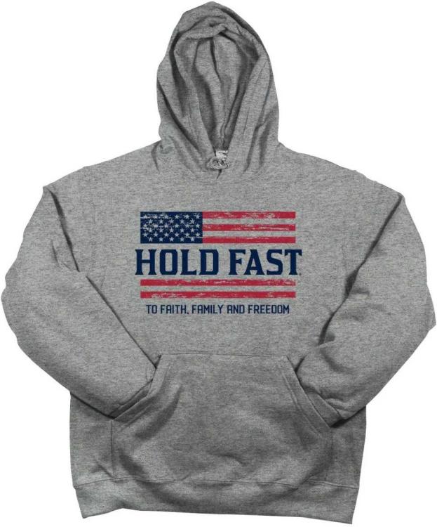 Hold fast to your values and stand up for what you believe in when you wear this classic 2 Color Flag Hooded Sweatshirt by HOLD FAST in Athletic Heather. You know what you stand for, and you aren t afraid to show it. Inspire your family, friends, and neighbors to look to you as an example of faith in our nation, and in the Lord.
