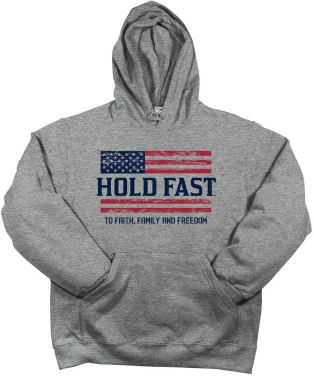 Hold fast to your values and stand up for what you believe in when you wear this classic 2 Color Flag Hooded Sweatshirt by HOLD FAST in Athletic Heather. You know what you stand for, and you aren t afraid to show it. Inspire your family, friends, and neighbors to look to you as an example of faith in our nation, and in the Lord.