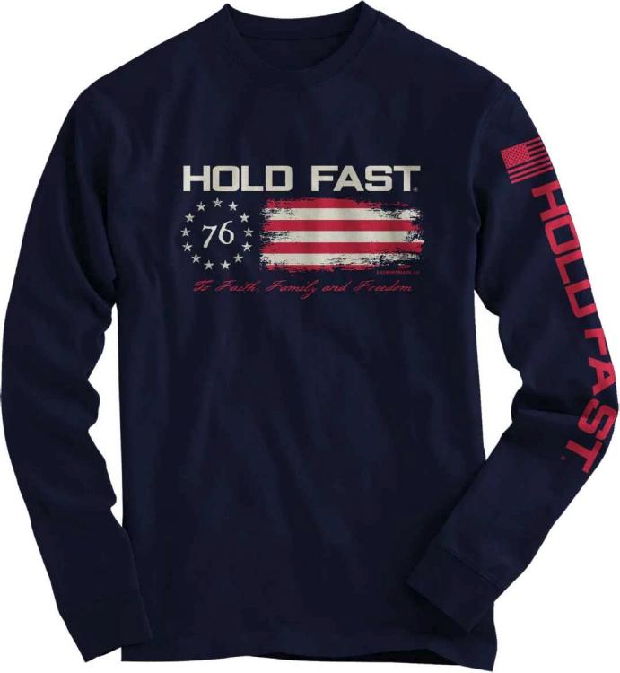 Celebrate the birth of our great nation in this patriotic Seventy-Six Flag HOLD FAST Long-Sleeve Tee in Navy. Our nation was founded on the principles of equality, freedom, and justice and early Americans were willing to fight for these ideals.