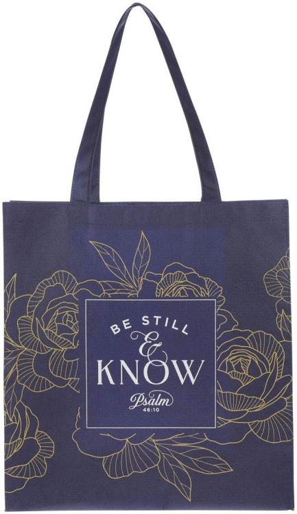 The Be Still Navy Reusable Non-woven Shopping Tote Bag is part of the Be Still Serene Roses Collection, which consists of a ceramic coffee mug, spiral journal, faux leather journal, faux leather Bible cover, gift bag, travel tumbler, scented candle in a glass jar, notepad, and pen set and reusable shopping tote.