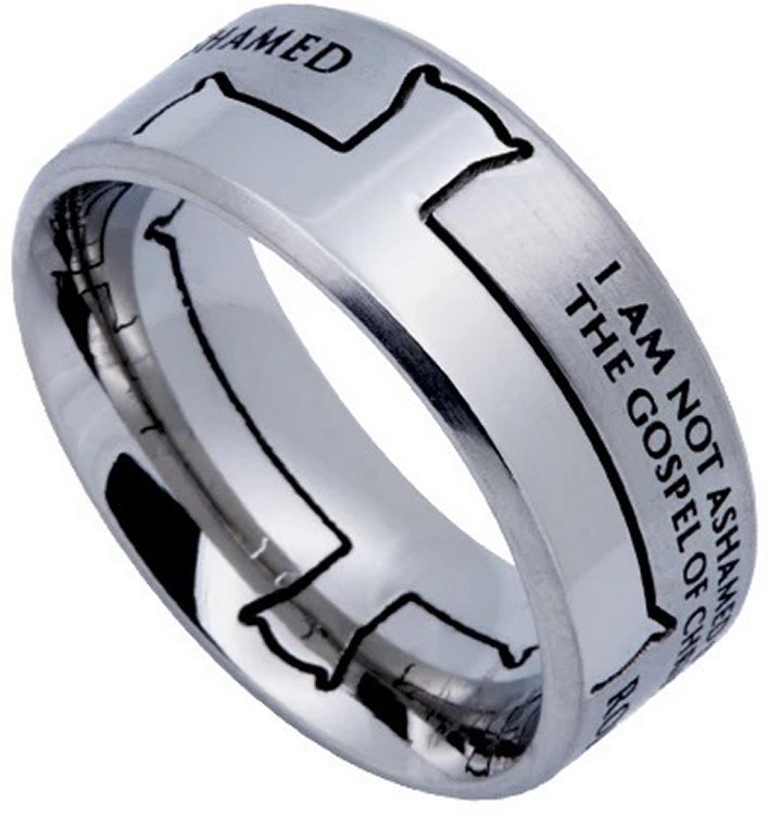 Brushed stainless steel ring with high polished split half cross on one side and half cross on the alternate side. Laser Engraved scripture reads, “Not Ashamed – Romans 1:16” on one side, and I Am Not Ashamed Of The Gospel Of Christ – Romans 1:16 on alternate side. Most popular band width. Comfort fit interior