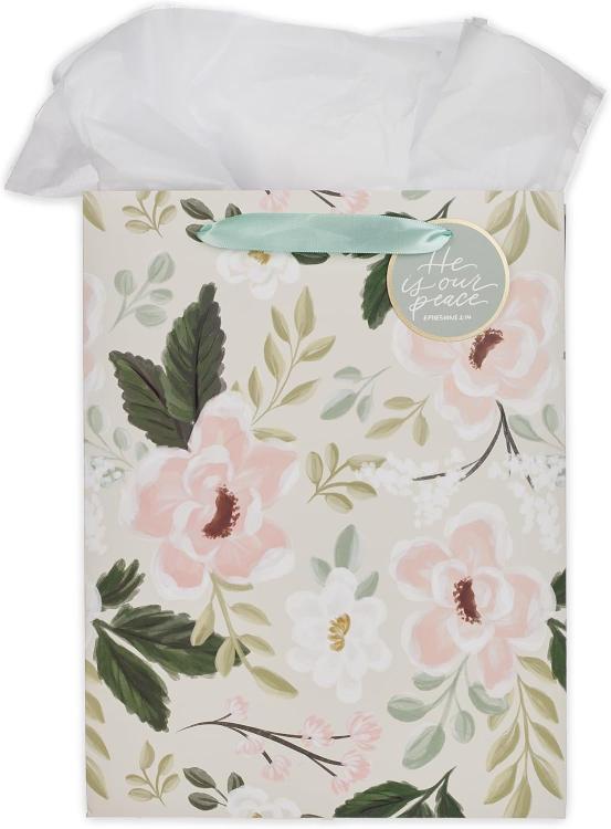 The He is Our Peace Green Floral Large Portrait Gift Bag is large enough to hold a Bible, devotional, or chunky sweater.