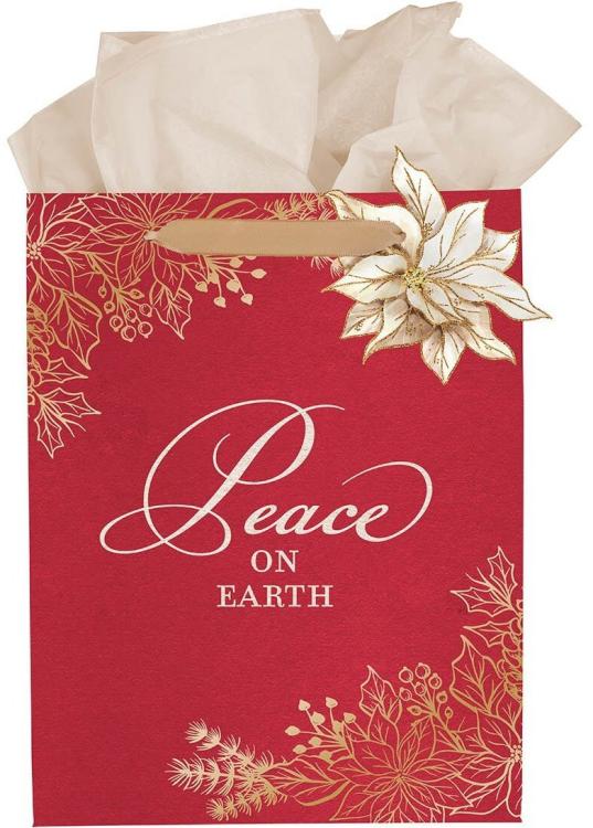 The classic charm of the Peace on Earth Cinnamon-Red Medium Gift Bag will add a sophisticated touch to your gift wrapping this Christmas season.
