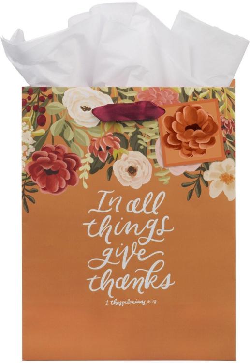 Express your gratitude with the Give Thanks Pumpkin Spice Medium Gift Bag~ designed with cozy autumn tones and a heartfelt verse perfect for Thanksgiving and beyond.