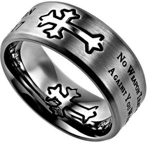 Brushed stainless steel silver double cross ring with high polished crosses. Engraved scripture reads, “No Weapon That Is Formed Against You Will Prosper ” on one side, and No Weapon Isaiah 54:17 on alternate side.