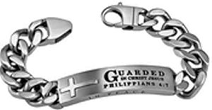Solid 316L matte finish stainless steel bracelet with high polished cross. Top of bracelet reads, Guarded In Christ Jesus Philippians 4:7 . Side 1 reads, In Peace . Side 2 reads, In Righteousness . Back side reads, The Peace Of God, Which Passeth All Understanding, Shall Keep Your Hearts And Minds Through Christ Jesus . Bracelet measures 8 1/2 long.