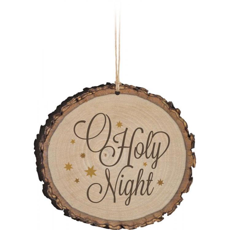 Ornaments are made from 1/4″ MDF and laser cut to provide the look and feel of the actual discrepancies in the exterior of the log. Using direct print technology, artwork is applied, giving these pieces the appearance of a sliced log. Looped with thin twine for hanging.