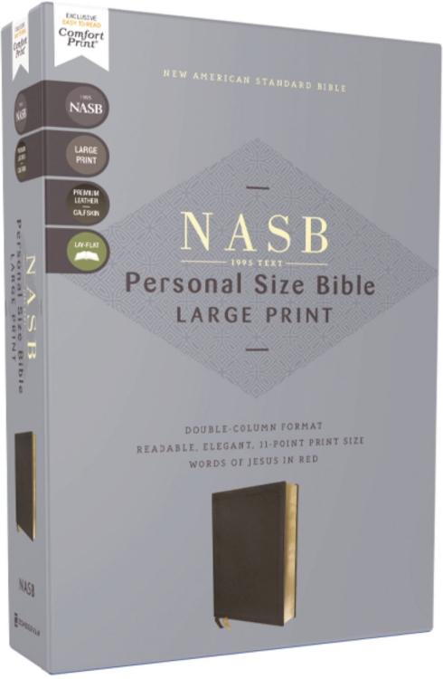 Easy to read. Easy to carry. Lasts a lifetime.This handsome genuine leather Bible brings readability and portability together in one neat, sophisticated package. Featuring a generous print size and the Zondervan NASB Comfort Print(R) typeface, this Bible provides a clear, smooth and comfortable reading experience for readers of all ages. Ideal for anyone looking for a Bible that is easy to read and easy to carry.Universally recognized as the gold standard among word-for-word translations, the beloved New American Standard Bible, 1995 Text, is now easier to read with Zondervan’s exclusive NASB Comfort Print(R) typeface. The NASB Personal Size, Large Print Bible gives you the translation celebrated for faithfulness to the original biblical languages in a readable and portable size.Features:The full text of the New American Standard Bible, 1995 TextDouble-column formatWords of Jesus in redPresentation PageTwo satin ribbon markersGenuine calfskin leather coverCover lies flat when openThumb IndexedExclusive Zondervan NASB Comfort Print(R) typefacePrint Size: 11