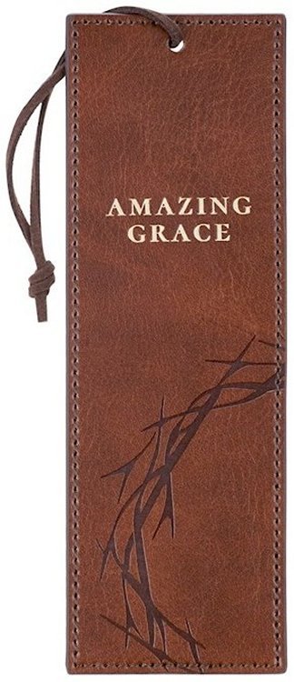 The Amazing Grace Chestnut-brown Faux Leather Bookmark is part of the Amazing Grace Brown Crown of Thorns Collection. This collection includes a Deluxe KJV Bible, a magnet, a genuine leather wallet, a faux leather bookmark, a metal keychain, a die-cut magnet set, a stainless steel travel tumbler, a classic journal, a paper bookmark with tassel, a faux leather Bible case, a giant print KJV Bible, a daily devotional, a gift bag a stainless steel water bottle and a spiral notebook.