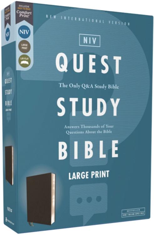 The NIV Quest Study Bible Answers Thousands of Your Questions About the Bible. One of the best ways to learn is to ask questions as you study. The NIV Quest Study Bible, Large Print guides you in that endeavor with thousands of questions you want answers for, including the top 100 most-asked questions about the Bible. It features over 7,000 notes written in an engaging question and answer format that give insight into the common, uncommon, and sometimes perplexing passages from the Bible.If you’ve ever read the Bible and found yourself asking, “Why did that happen?,” “What does this verse mean?,” or “How does this story impact my life today?,” then the NIV Quest Study Bible is the ideal resource. Dive in to discover that you’re not the only one with questions-and finally get the answers you’ve been looking for.The only question and answer Bible also features the exclusive Zondervan NIV Comfort Print(R) for smooth reading. Expertly designed specifically to be used for the New International Version (NIV) text, Comfort Print offers an easier reading experience that complements the most widely read modern-English Bible translation. The original Quest Study Bible was conceived in 1989 when two publishing companies, Zondervan and Christianity Today International, worked together to develop a Bible that would answer the challenging questions that arose as people read Scripture. Focus groups around the United States evaluated the usefulness of potential study Bible features and helped select the features that would be included in this Bible. Then, more than 1,000 people received passages of Scripture and were asked, “What questions do you have about this portion of the Bible?” Their responses helped determine what kinds of questions the notes would answer, helping to create a resource that answers the questions that real people have asked about the Bible. Now, with over one million copies sold, notes have been updated in subsequent releases to ensure that this Bible stays relevant and current to modern readers.Features:Complete text of the accurate, readable, and clear New International Version (NIV)Over 7,000 insightful notes arranged in a unique question and answer formatNearly 350 articles investigate the most asked questions about the BibleBook introductions that answer questions about each book, such as “Who wrote it?,” “Why?,” and “What should I look for?”Article index and expanded subject indexSingle-column Scripture text arranged in a modern, two-color p
