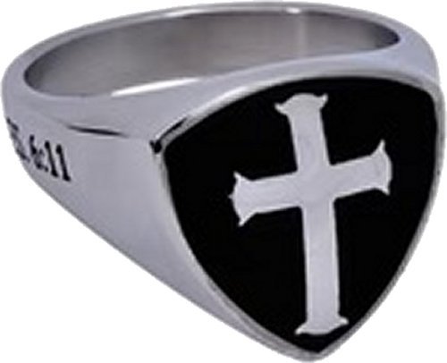 High polish stainless steel ring with high polish cross on black matte finish shield. Engraved and black enamel filled scripture wraps band reading, Guarded In Christ Jesus – Phil. 4:7 . Traditional Class Ring look without overpowering size.