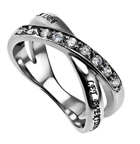 Stainless steel, high polished, twin band ring. One ring has 9 set cubic zirconium stones covering one half side. Second ring has black scripture engraving reading, “Let Everything That Has Breath Praise The Lord – Psalm 150:6”. This is a solid one piece ring.