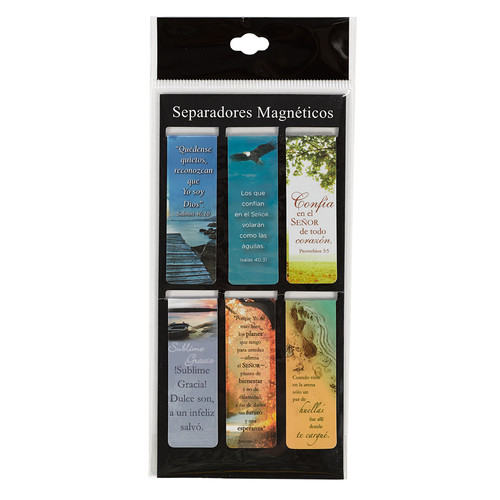 Marque su página con estilo con esta colección de seis separadores magnéticos clásicos. El diseño es una mezcla de arte~ versÃculos de la Biblia y frases inspiradoras. Cada cartón tiene seis motivos diferentes que hacen juego y en cada paquete hay tres cartones. Ideales para compartir con amigos~ regalar en la clase de estudio BÃblico~ para poner uno en cada libro~ etc. Económicos~ prácticos y muy atractivos.