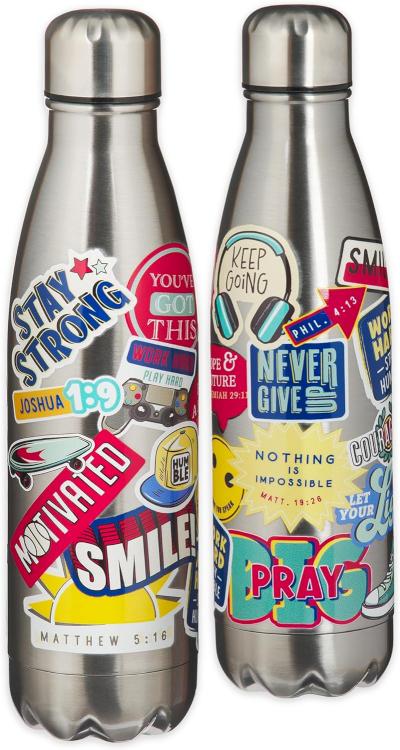 The stainless steel water bottle has a bright-colored sticker design, highlighting uplifting and positive messages and inspirational Scripture verses.