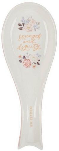 Whether preparing a celebration brunch for your Bible study group or looking for a housewarming gift, the Strength and Dignity Pink Floral Ceramic Spoon Rest will be a great addition to any kitchen.