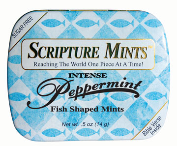 Each tin is filled with .05 oz. of deliciously flavored intense breath mints. The mints are cut out and shaped like little Christian fish. Each pocket tin has a Scripture verse printed on the inside of the lid and a brief explanation of the Christian fish
