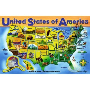 This wooden 45 piece puzzle helps teach individual state names and capitals, as well as providing notable state information. The capital and state outlines are under the puzzle pieces. The back of the puzzle board features the additional state information. Also includes extension activities. Recommended for ages 5 and up.