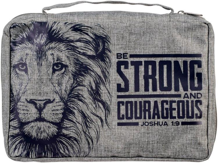 Store your Bible in a sturdy Bible case with a fierce and encouraging message when you use the Strong and Courageous Lion Gray Value Bible Cover—a Bible case with a dramatic design to complement a positive message.