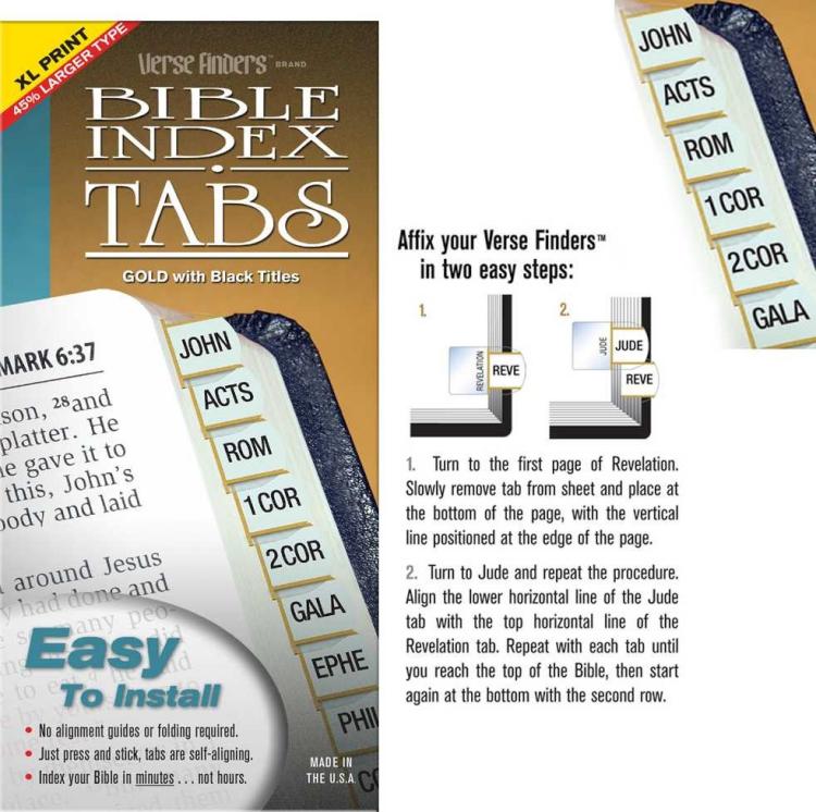 Features: Easy to install – no alignment guides or folding required. Just press and stick. Tabs are self-aligning. Index your Bible in minutes…not hours. Attractive and durable for years of trouble-free use. Horizontal style – reads left to right. Compact 3/8″ design indexes a standard Bible in only 2 rows, making books easier to find.