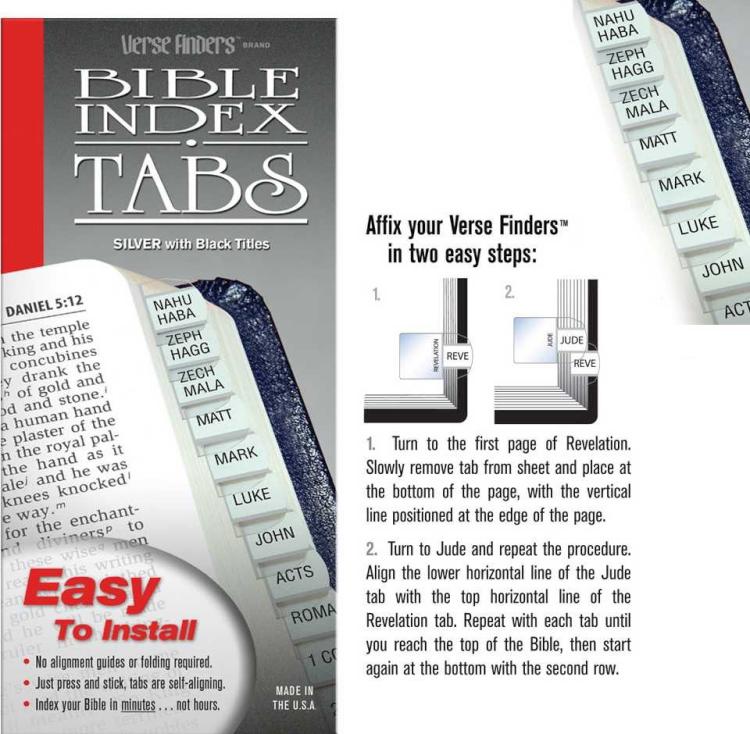 Features: Easy to install – no alignment guides or folding required. Just press and stick. Tabs are self-aligning. Index your Bible in minutes…not hours. Attractive and durable for years of trouble-free use. Horizontal style – reads left to right. Compact 3/8″ design indexes a standard Bible in only 2 rows, making books easier to find.
