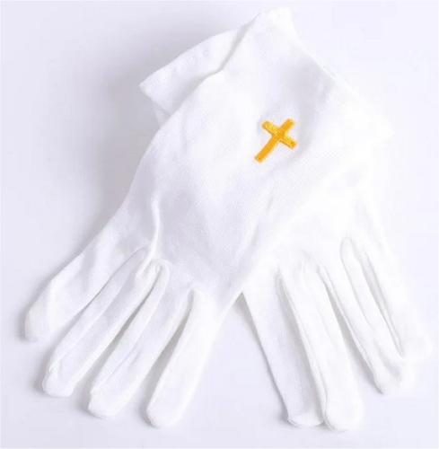 White gloves (with gold cross). Worship Gloves. Cotton gloves help protect hands and bells, and are a nice touch for special occasions.
